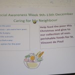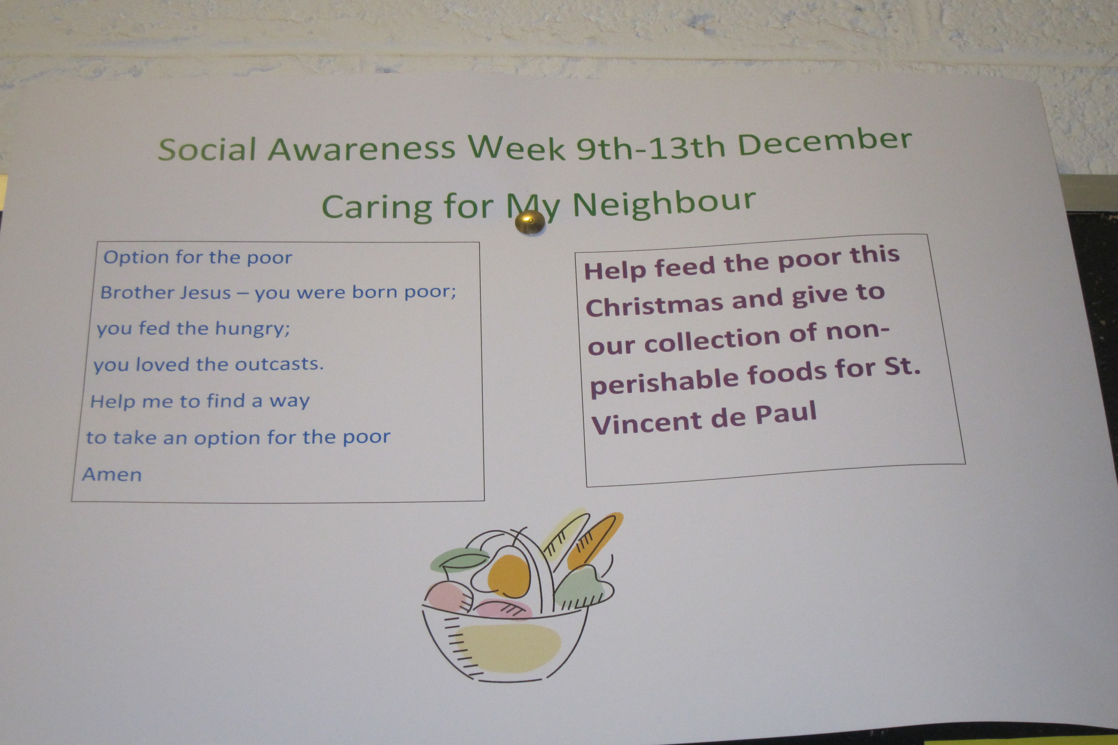 They did poster displays in Our Lady of Fatima and St. Felims, they taught poverty modules to all the juniors classes and did the St. Vincent De Paul Food Appeal with all seniors.