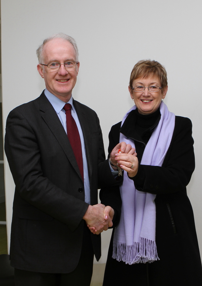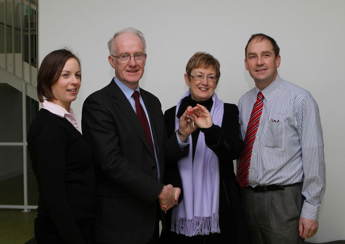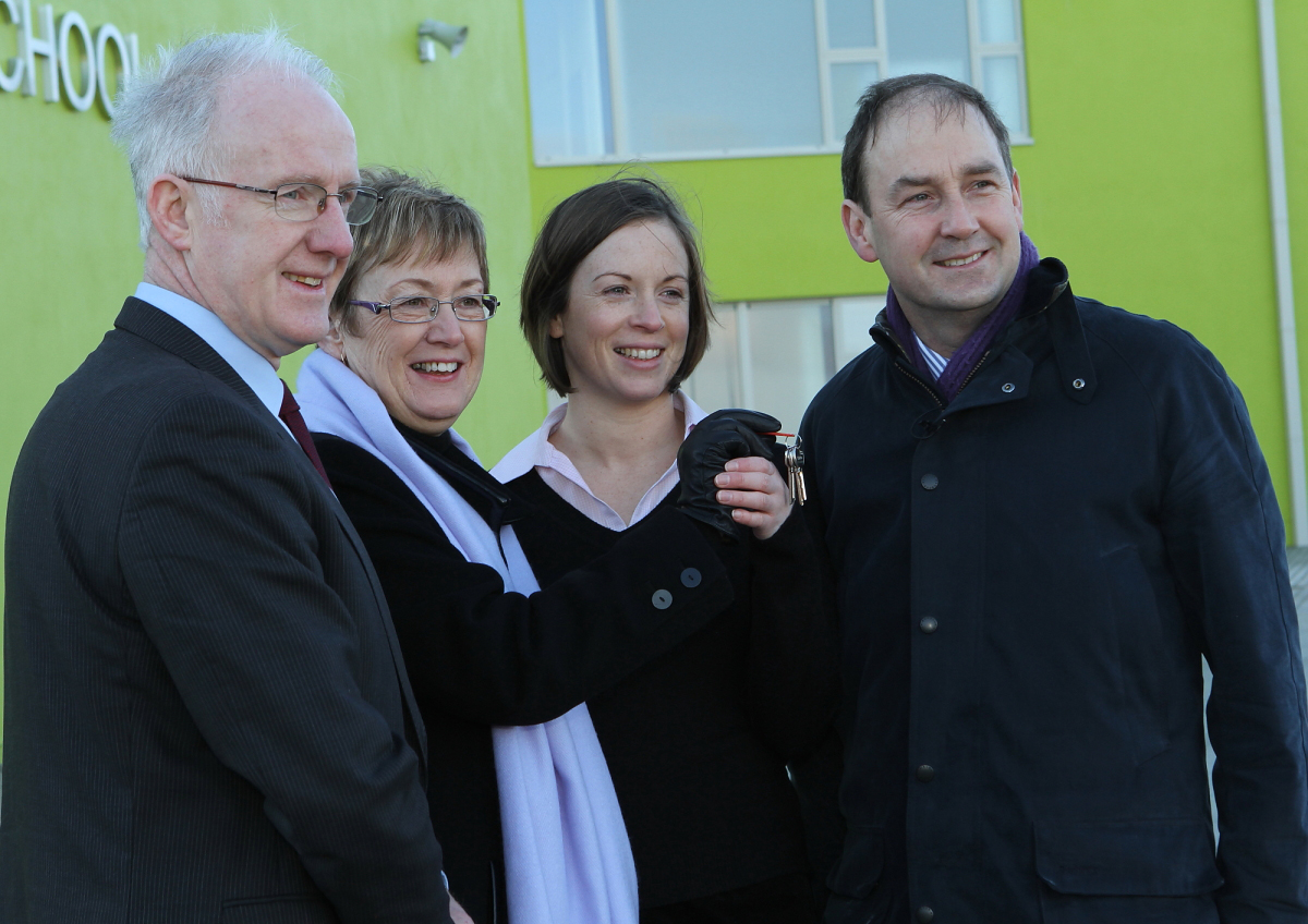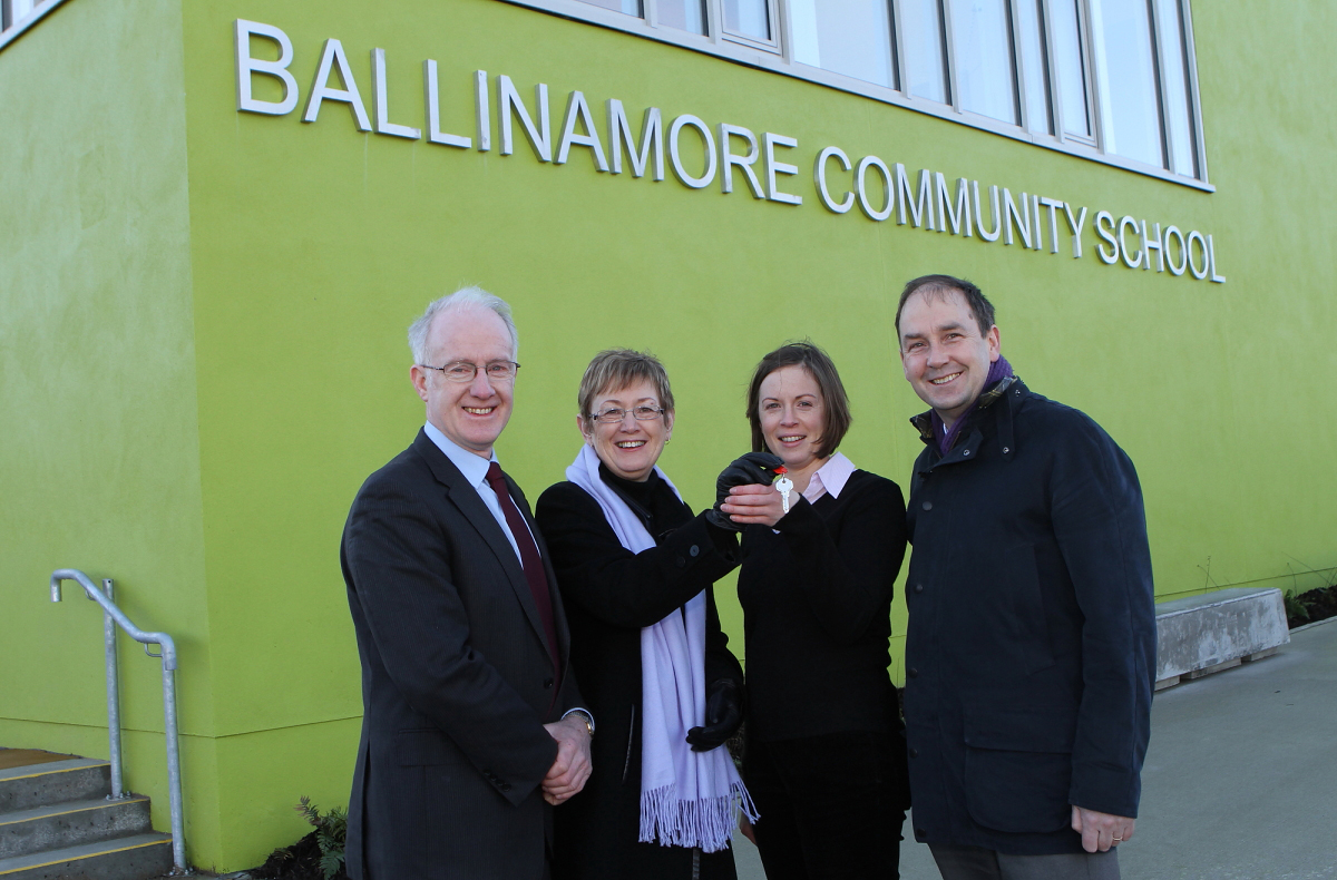 This morning February 11th 2014, the keys to the new Ballinamore Community School building was officially handed over by Mary McKeon on behalf of BAM FM to Maire O’Connor, Chairperson of the Board of Management of Ballinamore Community School. Also pictured in the photo below are Padraig Leyden (Principal) Diarmuid McCaffrey (Deputy Principal).