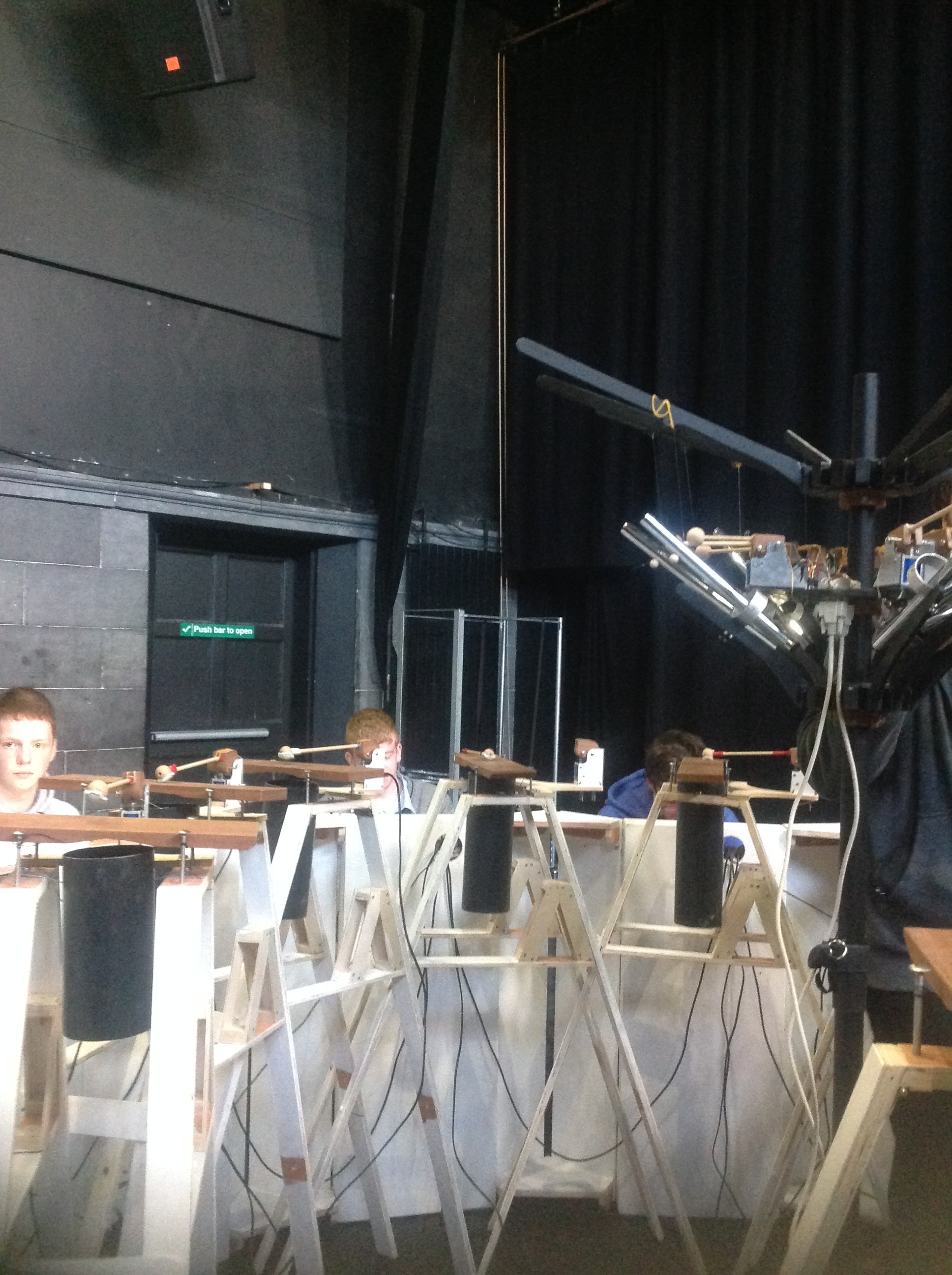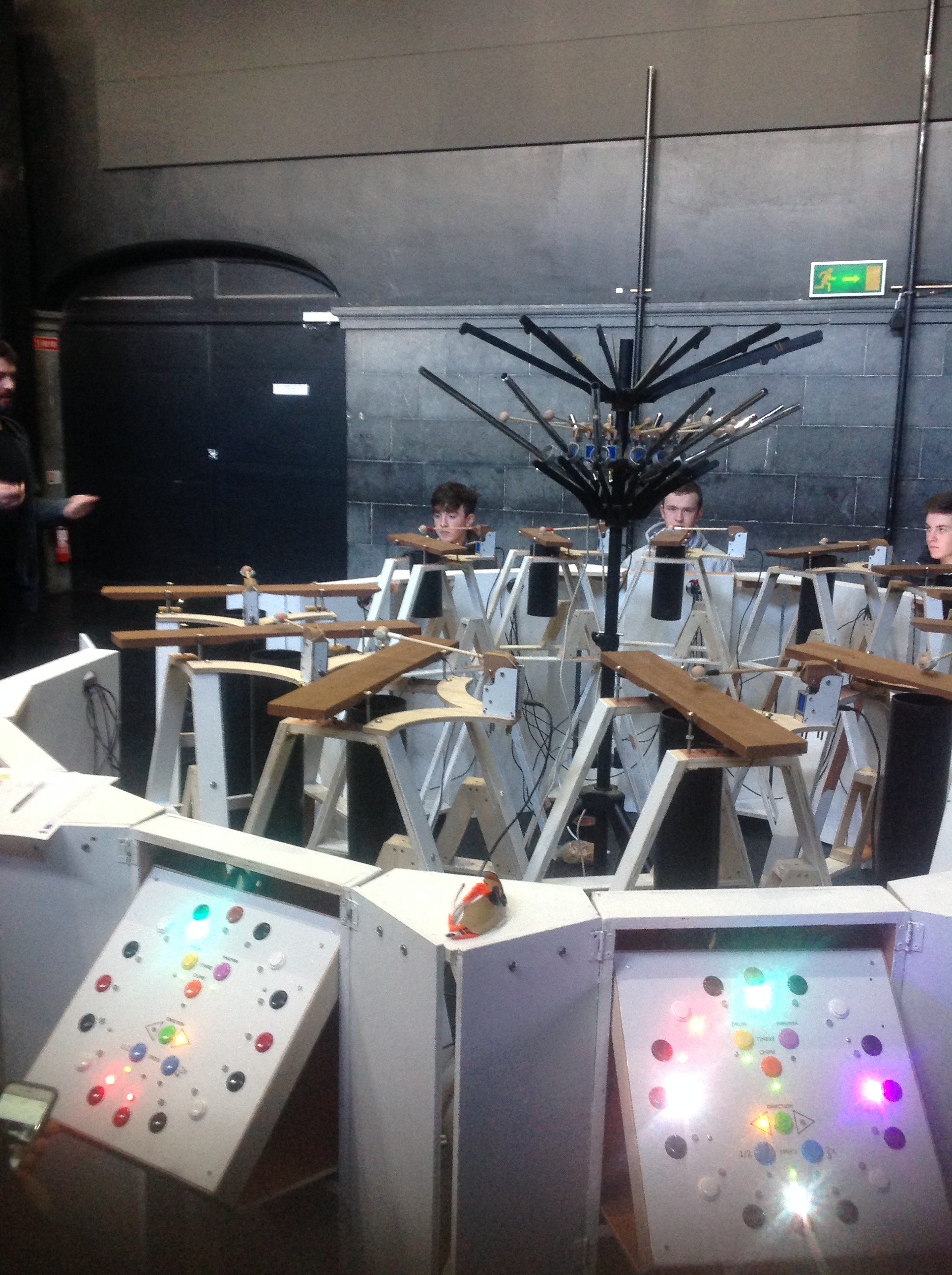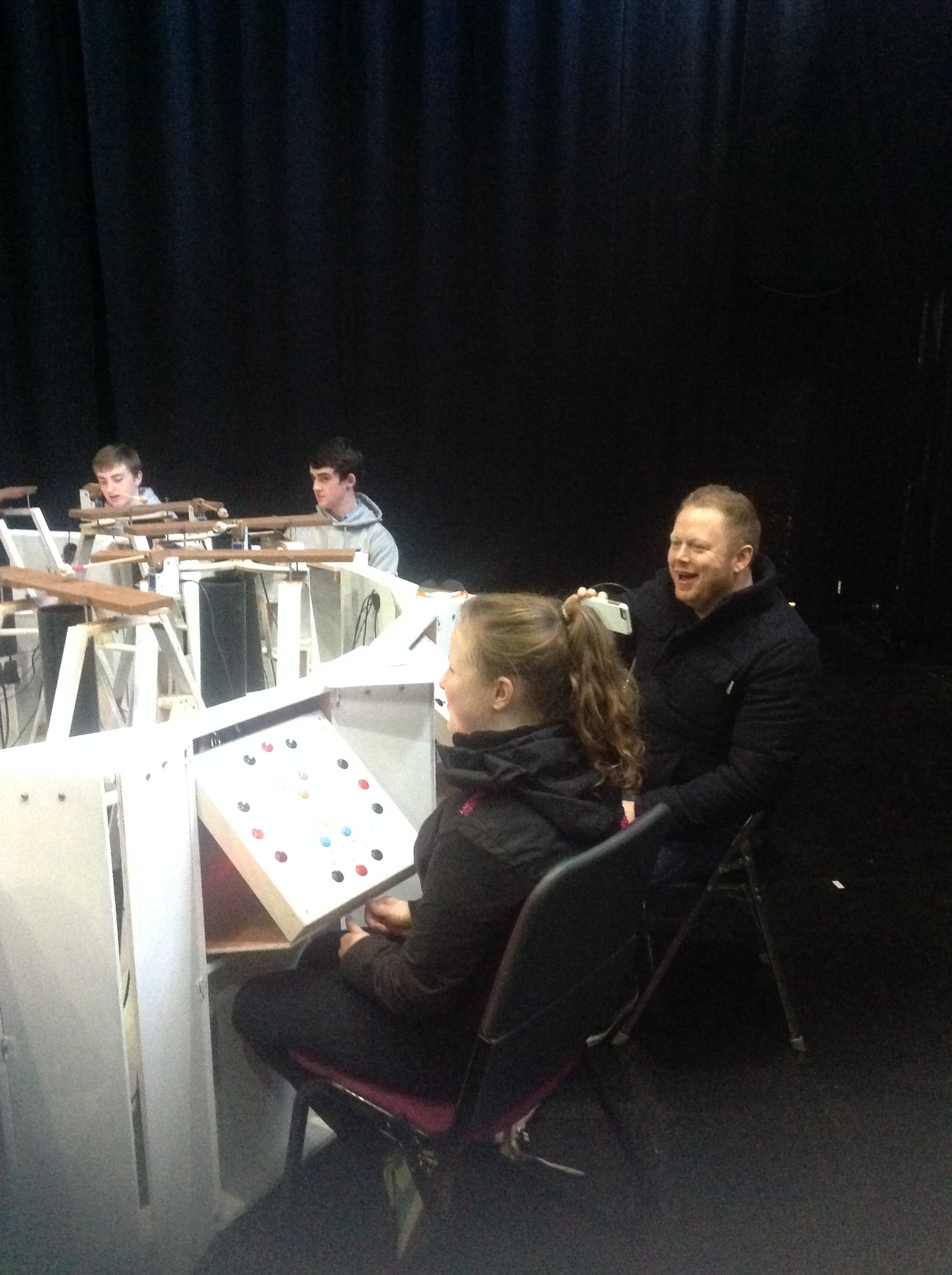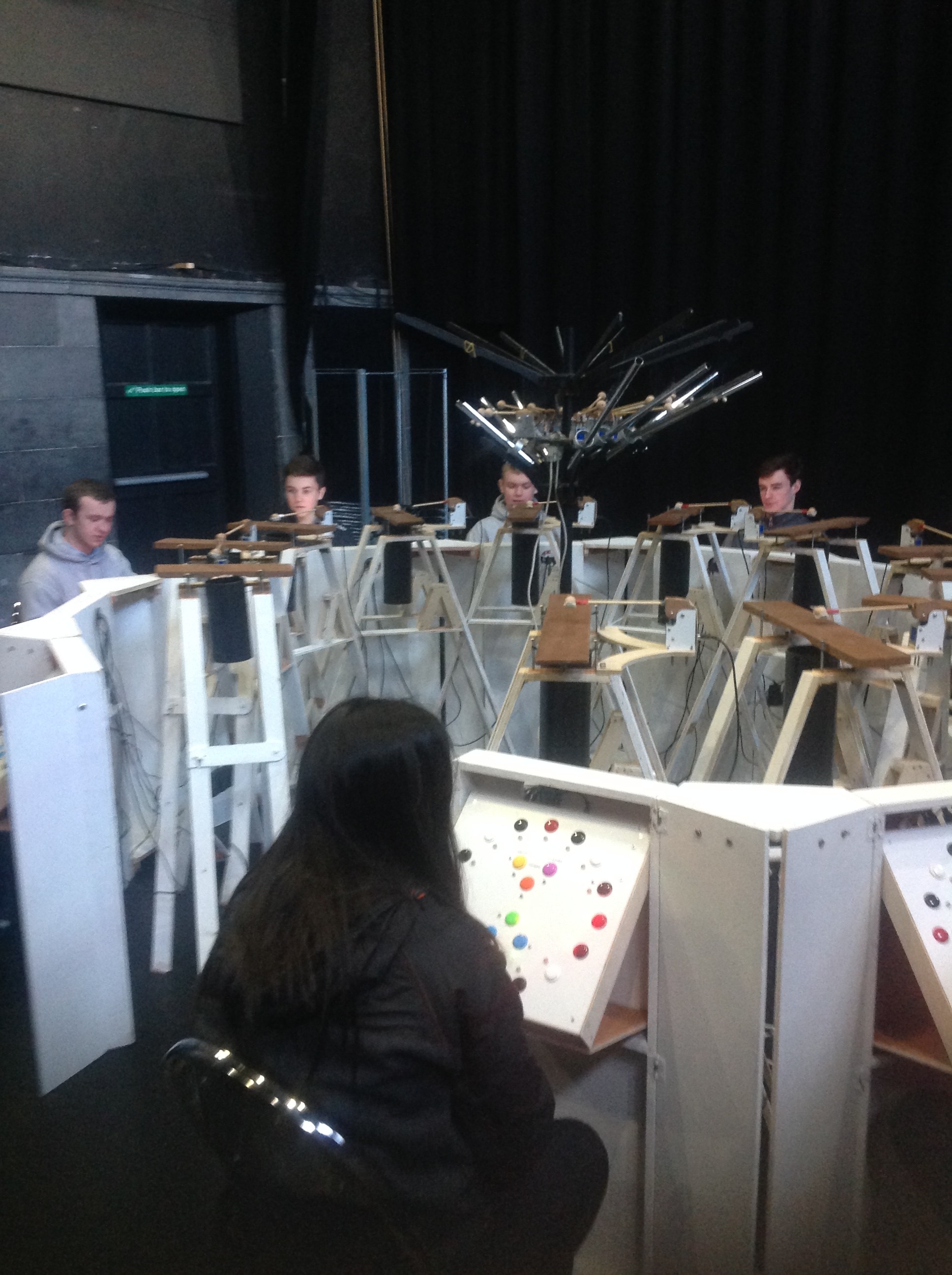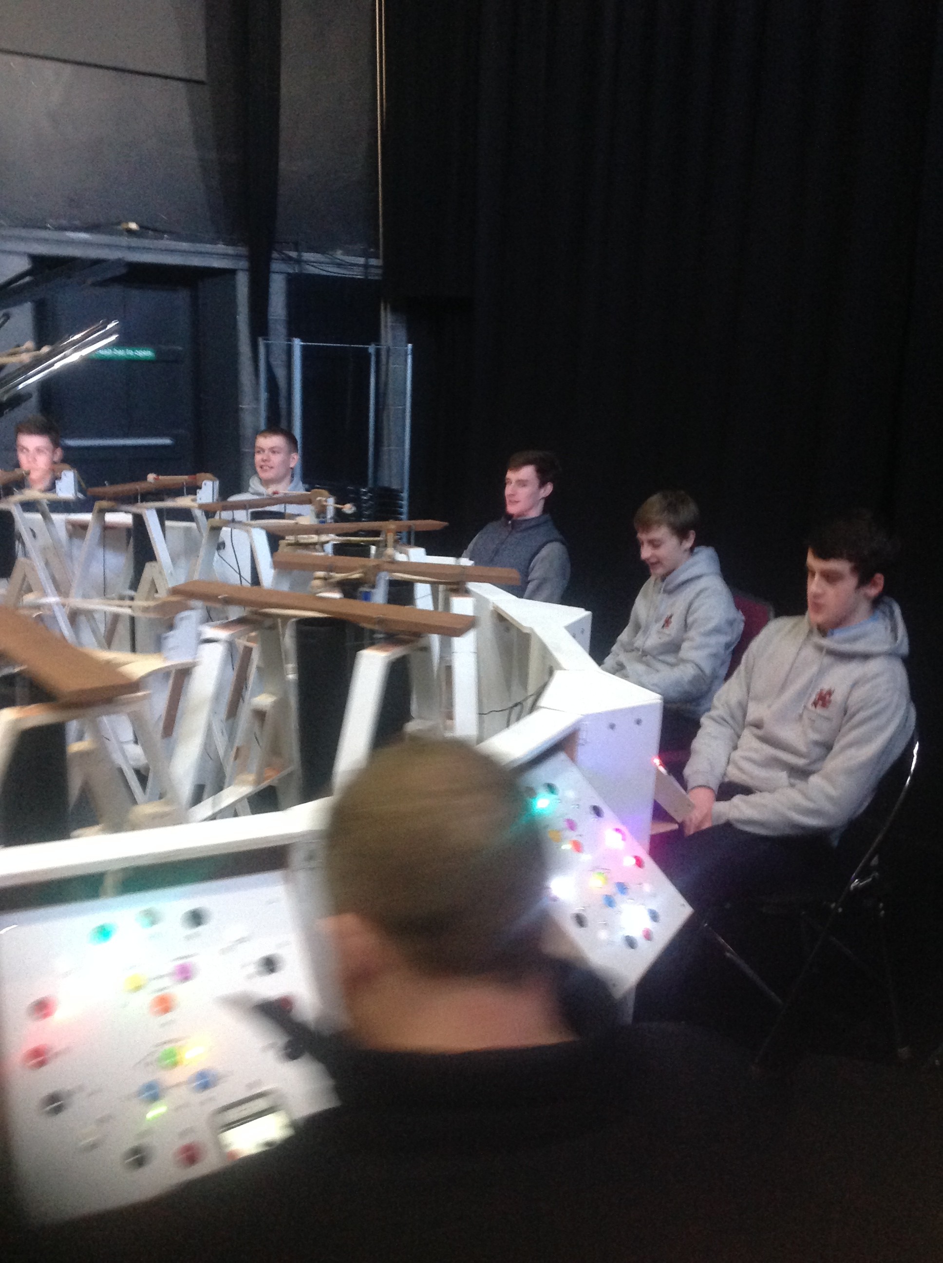 Dodeca Cycle is an electronic and mechanical music installation designed and built by Ed Devane in 2014. The system allows people to make intricate rhythmic and melodic music. TY students took part in the workshop on the 26th February in the Dock Arts Centre in Carrick on Shannon and created their own sounds using the unit which were then recorded. Upstairs in the exhibition space there were two exhibits that the curator in The Dock explained to students. The exhibition continues until Saturday 28th March.