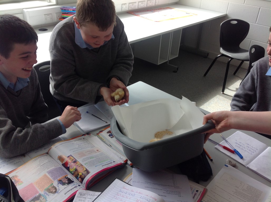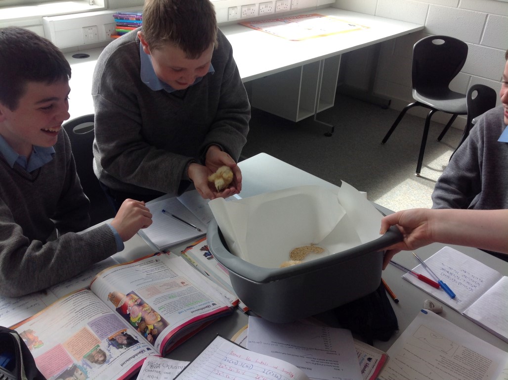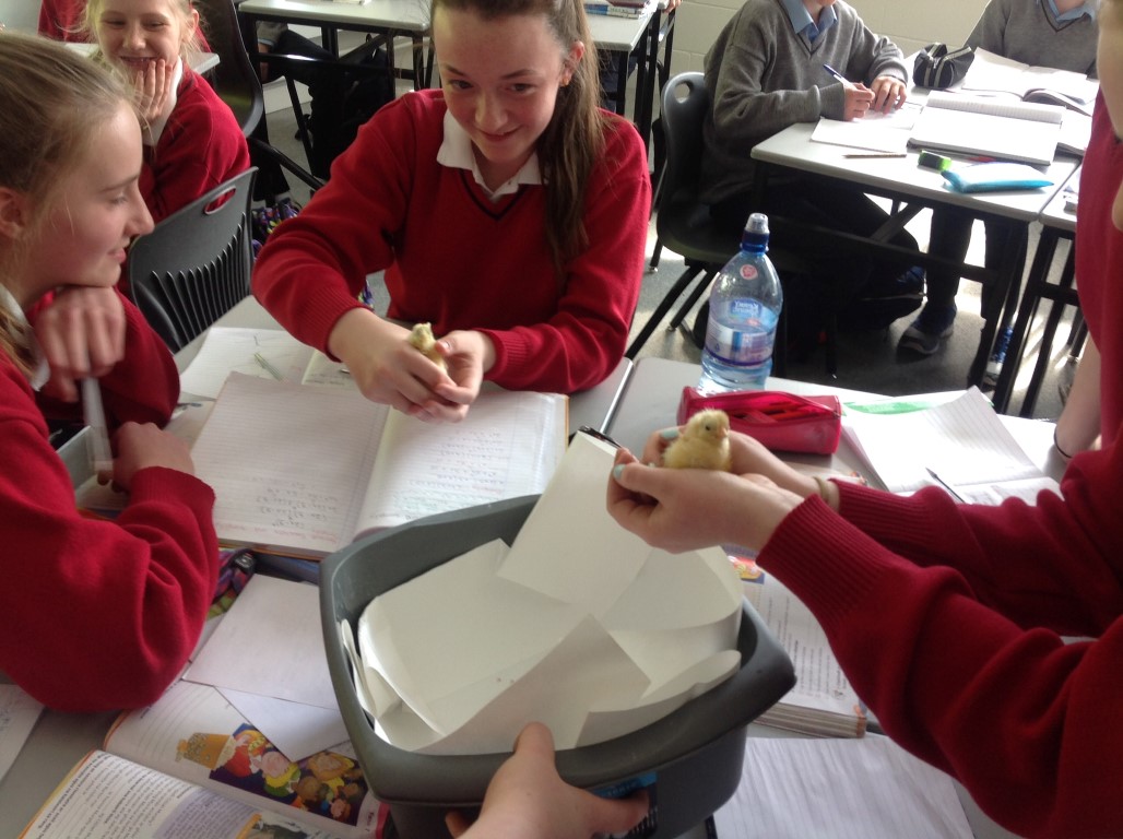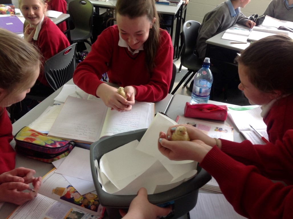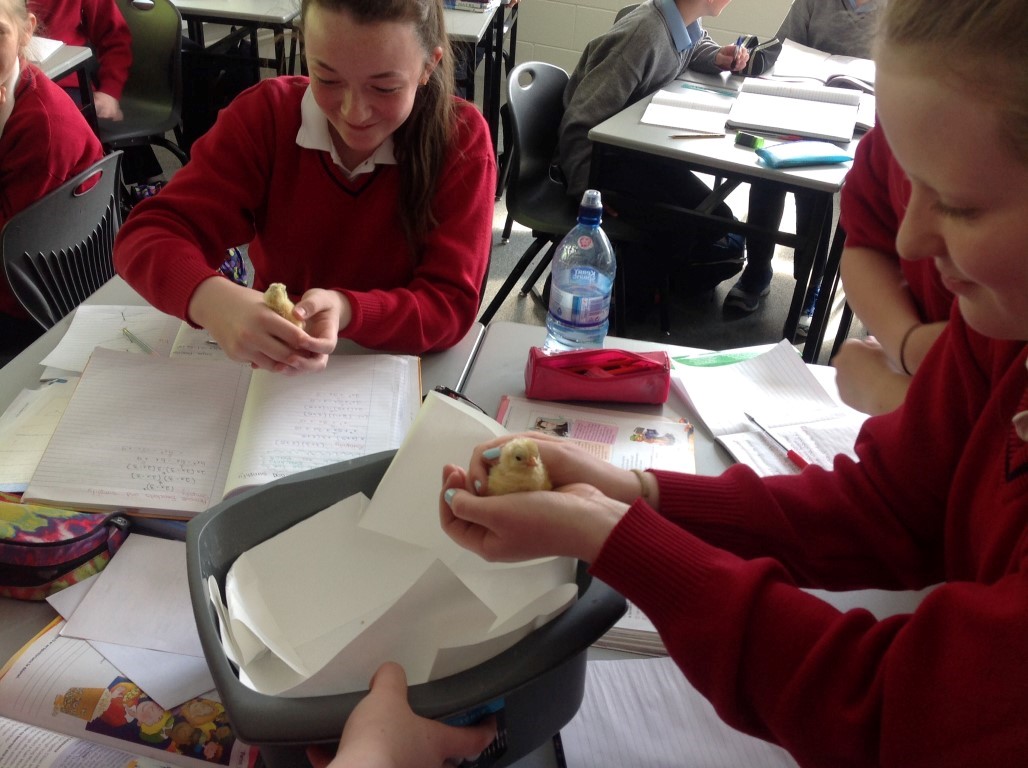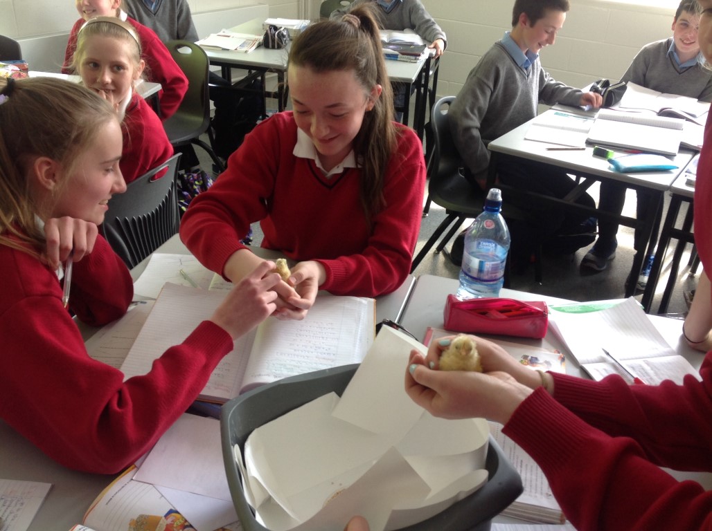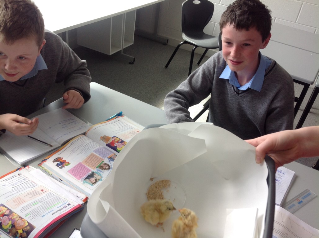 After waiting three weeks our chickens hatched out and were delighted to meet the students at Ballinamore Community School.