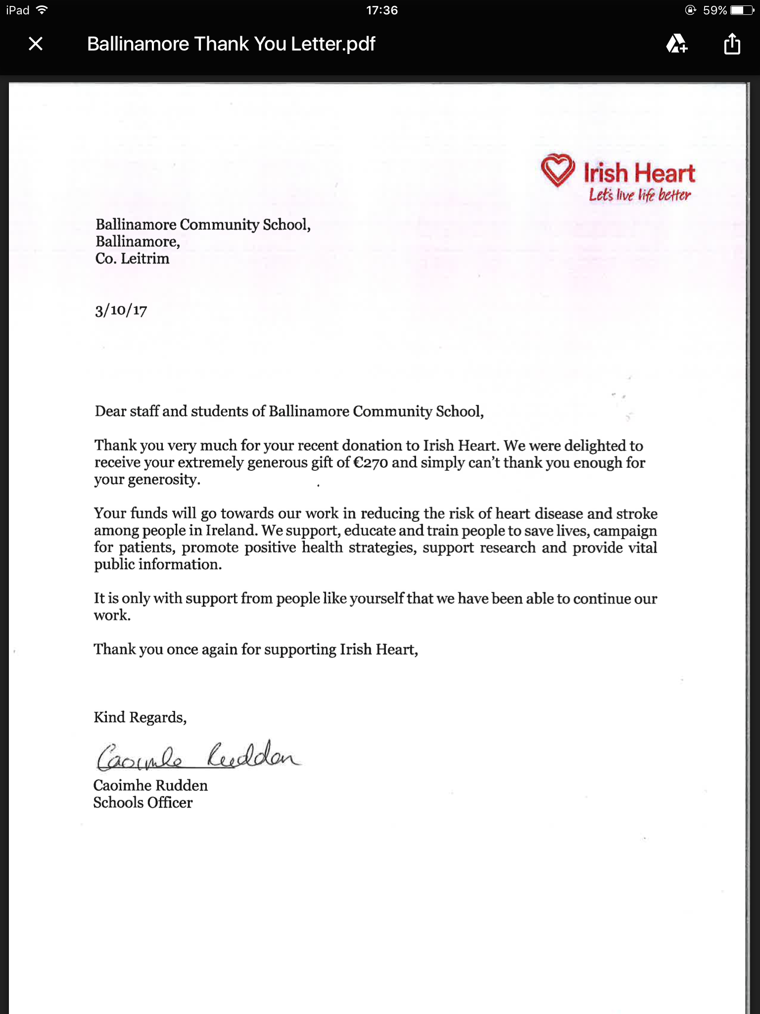 On Monday 2nd October Caoimhe Rudden (Schools Officer for the Irish Heart Foundation) visited the school. She gave a highly informative presentation to 5th and 6th year Home Economics students on the area of heart health and the importance of maintaining a healthy diet and exercise to promote good heart health. We held a fundraiser in school last year (in the last term) where we raised €270 and after the talk we presented the cheque to Caoimhe on behalf of Ballinamore CS.