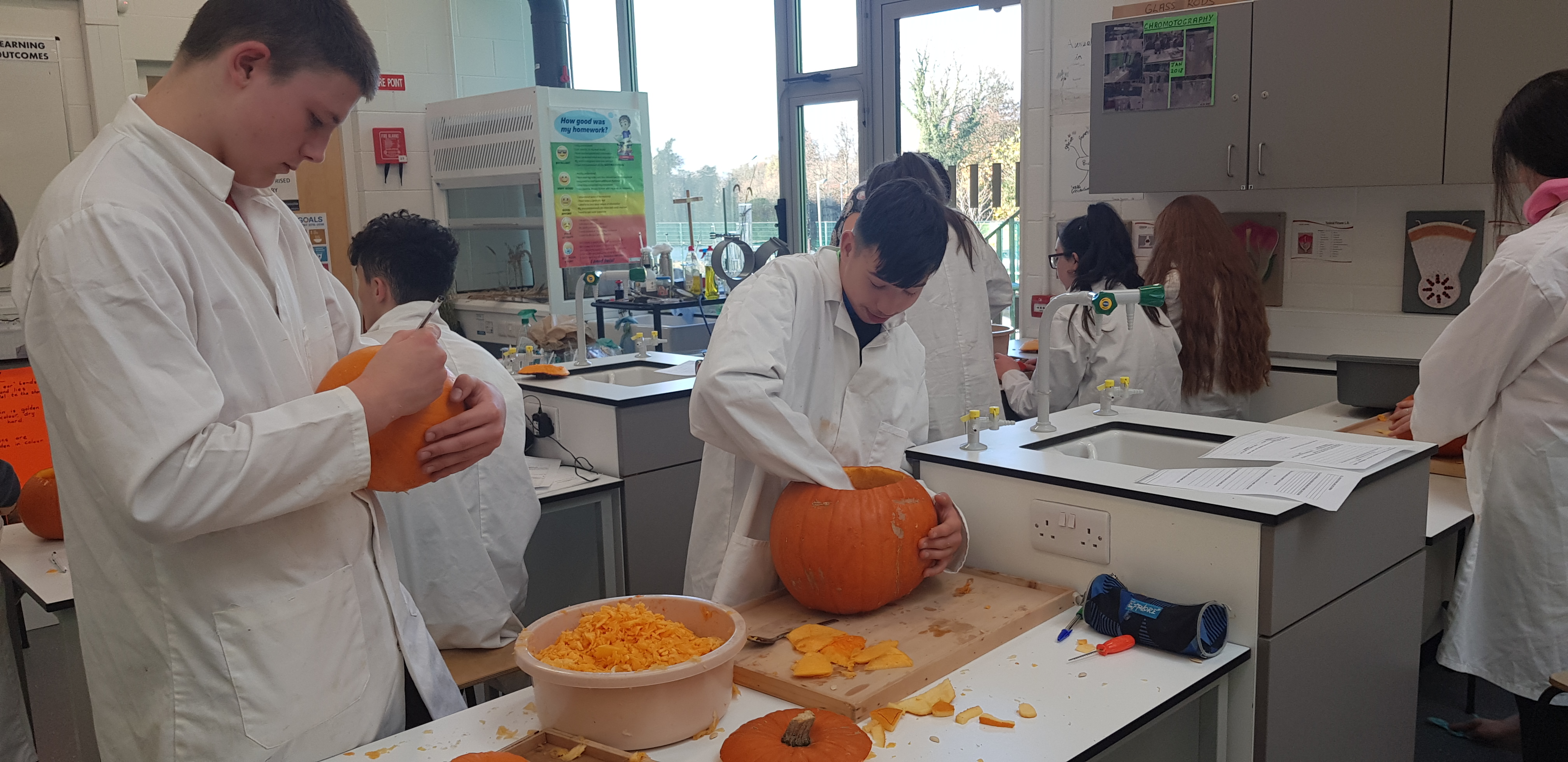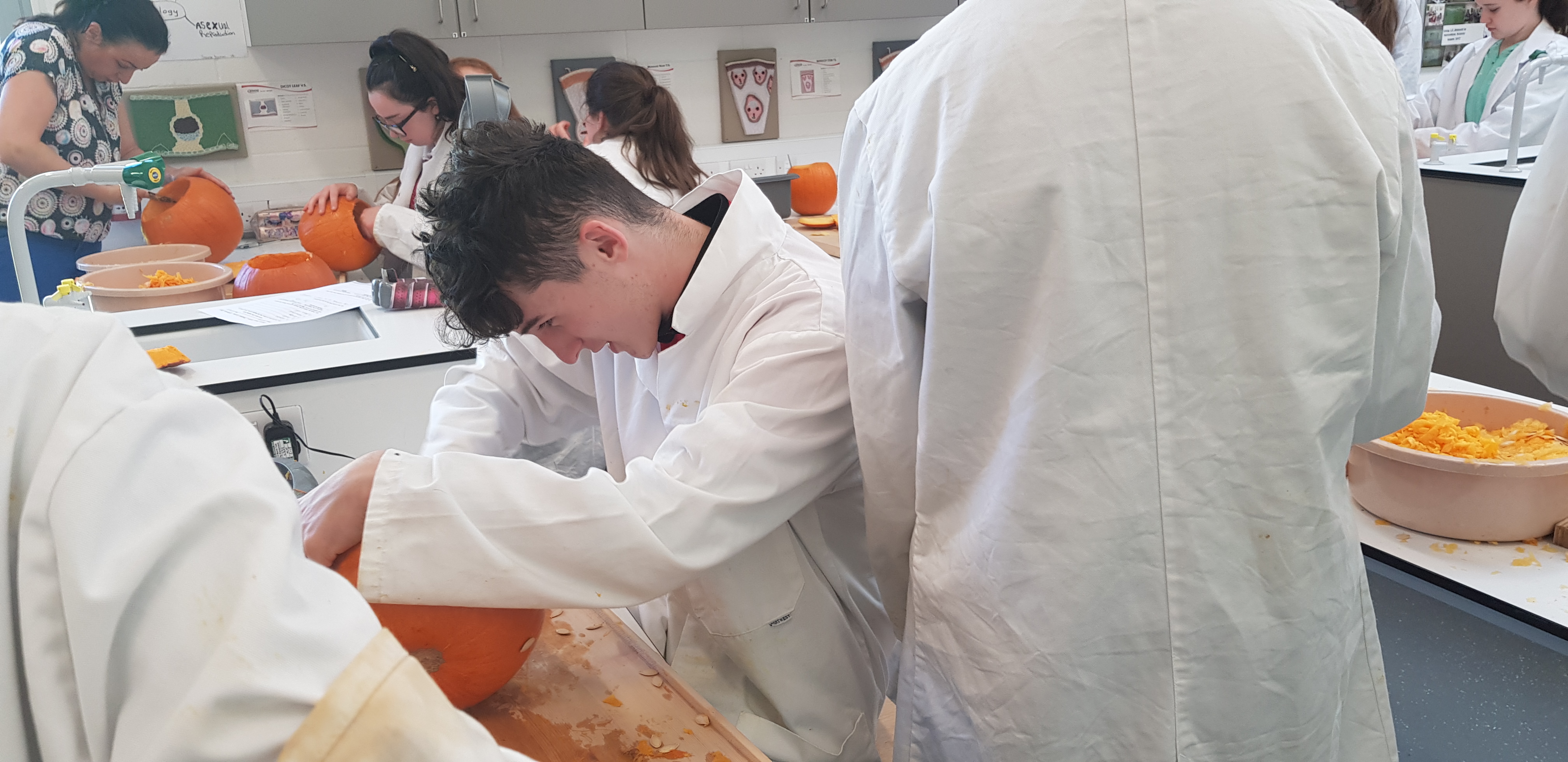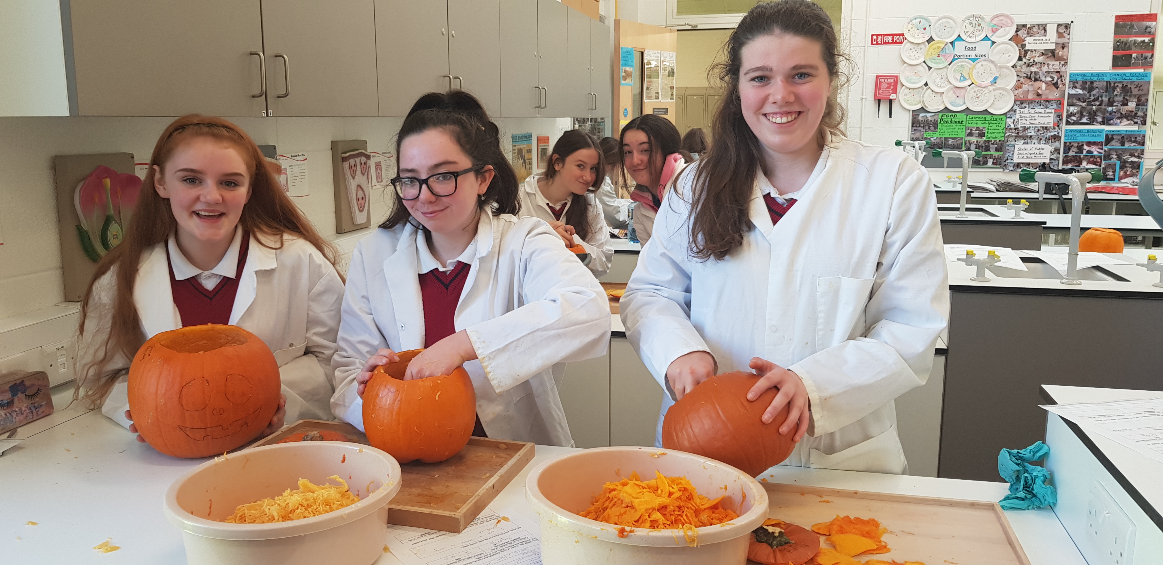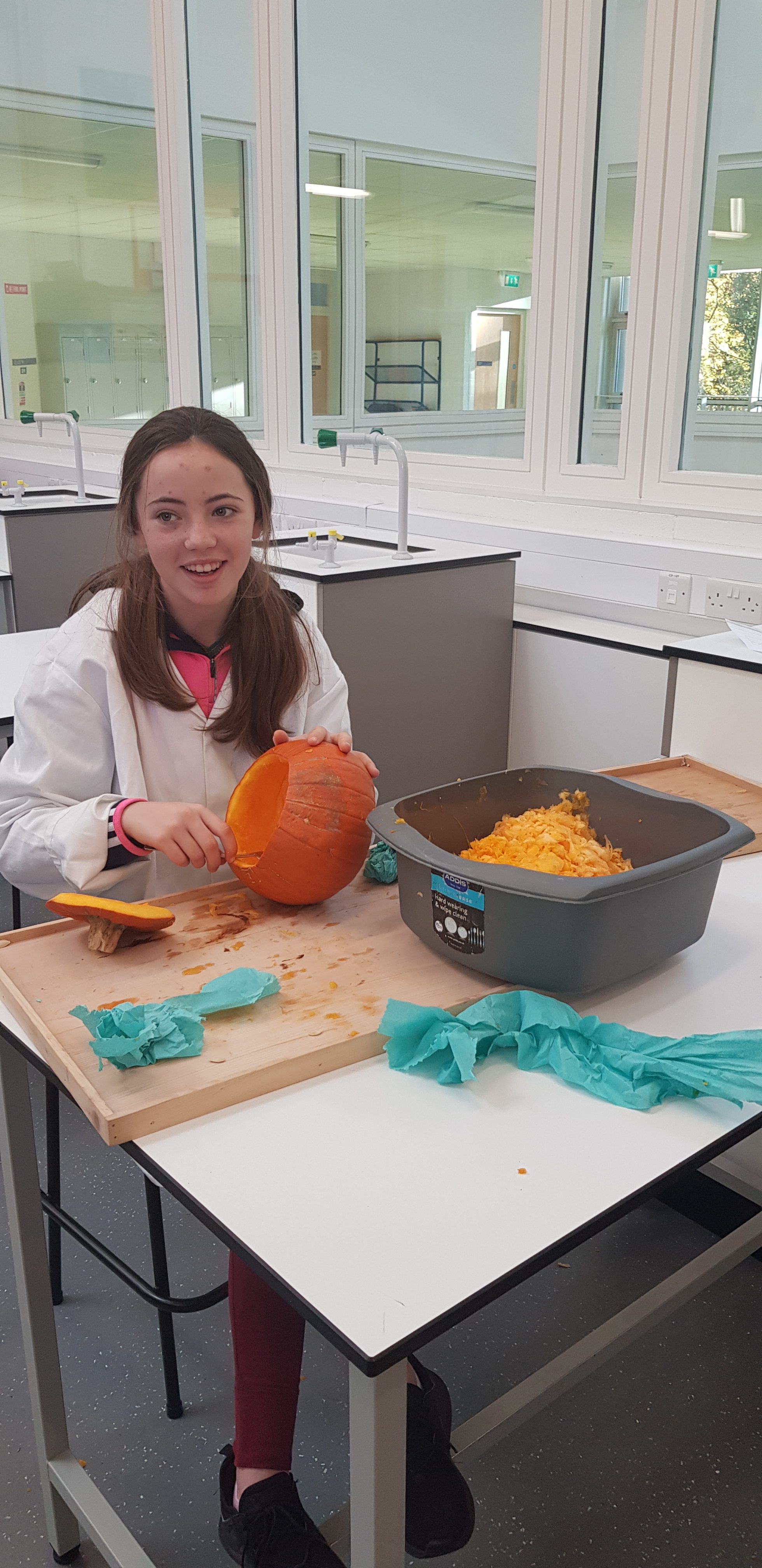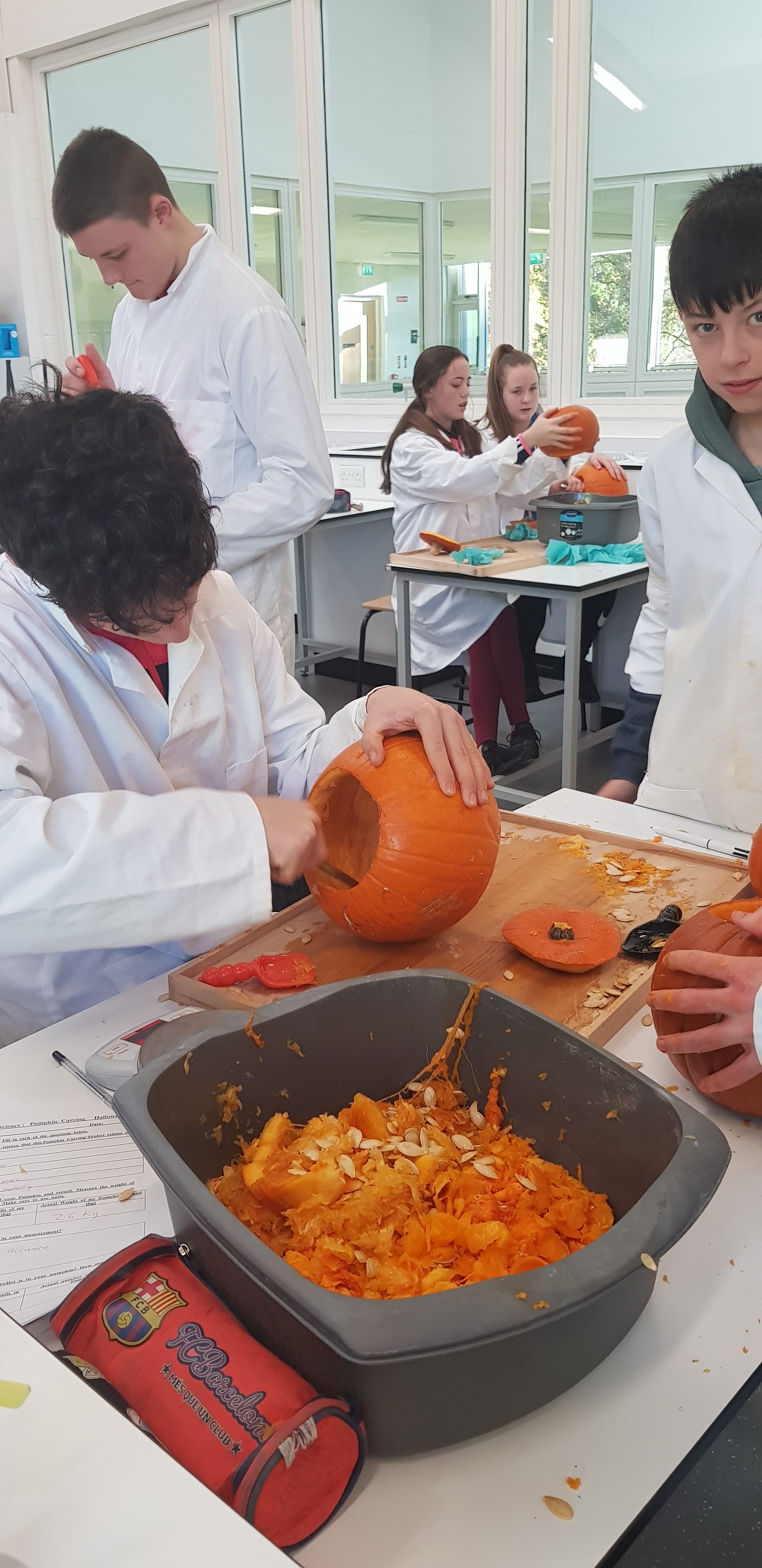 Ms Colum’s science classes began by examining the pumpkin (from investigating measurement, weight & circumference, counting number of seeds, looking at plant cells, genetics through variation of pumpkins) and then developing their artistic/craft skills they designed and carved out their pumpkin creations. The pumpkin flesh was then used in Home Economics cookery class to make delicious pumpkin soup which students and staff all got to sample. The seeds were also used up by roasting them in the oven and made a lovely high fibre snack. This cross curricular project linked in with aspects of wellbeing and our current green schools project.