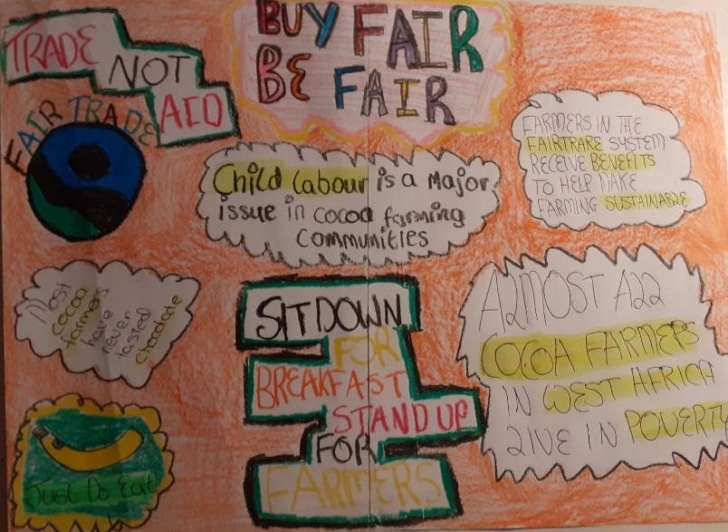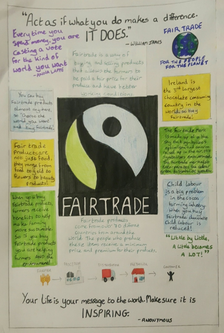 As part of Fairtrade Fortnight 2021, Home Economics students learned more about what exactly fair-trade is, how different our food can look in its original state before it reaches our table, and the impact our shopping choices and habits can have for Fairtrade farmers and those who produce all our favourite foods & drinks like tea, coffee, chocolate, fruit and even our clothes. This years Fairtrade theme was around cocoa highlighting the importance of farmers being paid fairly for their work and being able to earn a living income. Students completed the chocolate quiz to learn more interesting facts about chocolate production and 1st years entered a Fairtrade Poster competition to encourage family and friends to choose fair-trade products when shopping. Congratulations to Saffron Flynn who won first prize and to runners up Kate McCauley and Rosemary Brady. All their poster’s will be displayed on the GCE noticeboard also.