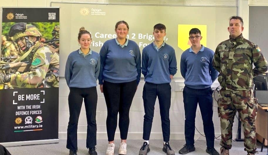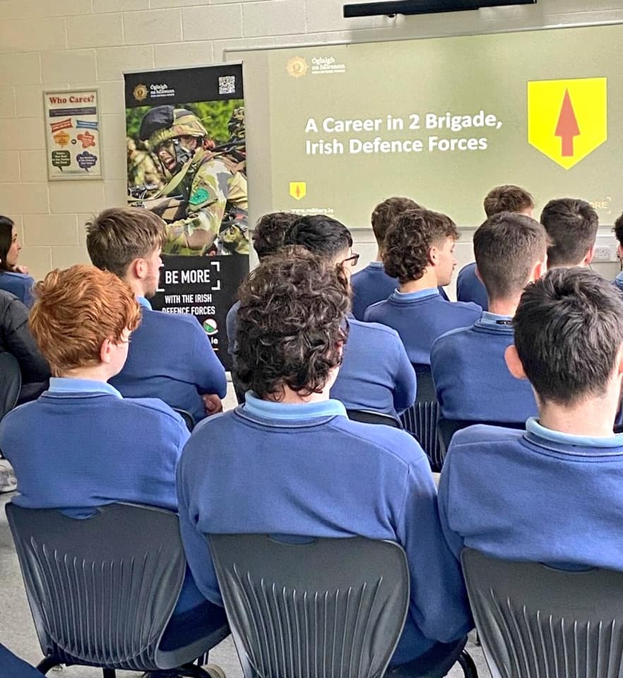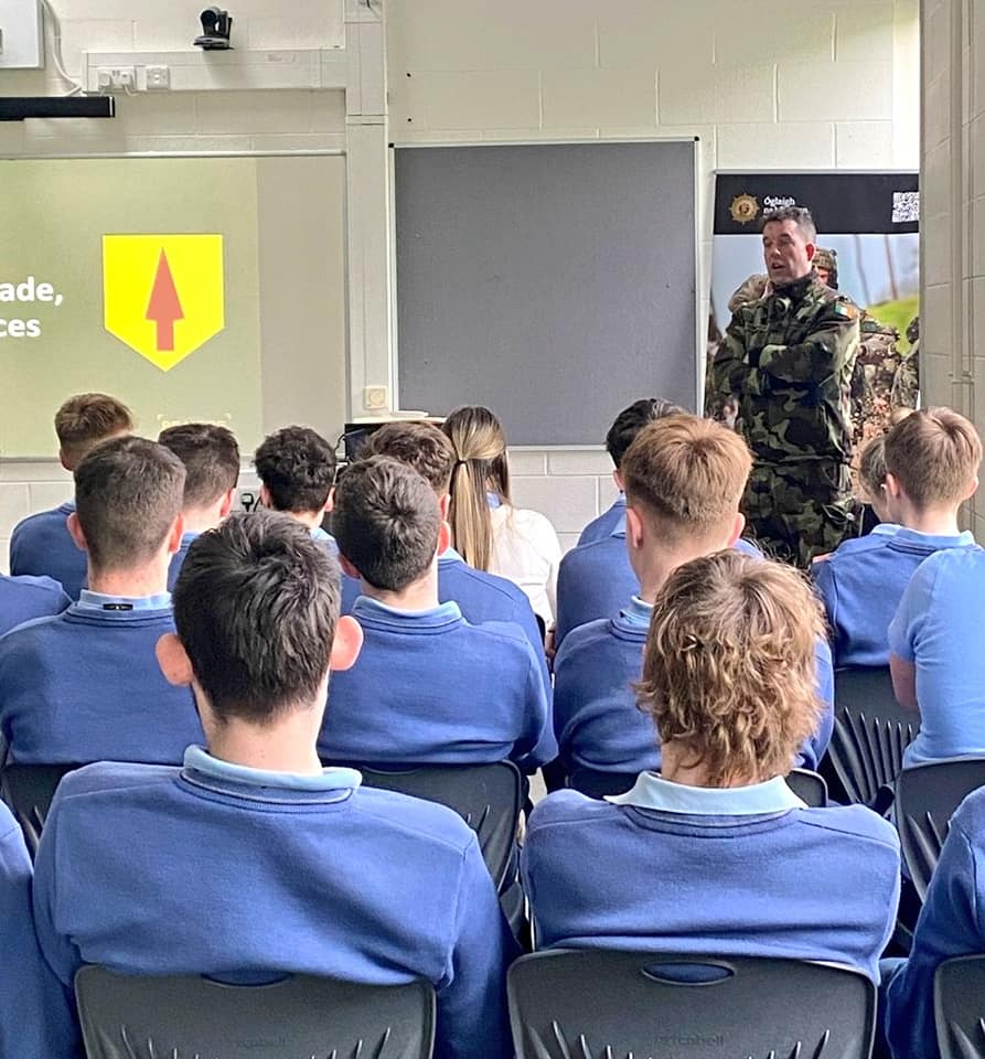 Ms Mannion’s 5th and 6th year Career’s classes attended a talk with Sgt John Campbell from the Irish Defence Forces today regarding possible careers in Central Medical Units, Cavalry Corps, Engineer/Ordanance Corps and Infantry Corps. The students were very enthusiastic and it was an excellent opportunity for them to meet Sgt Campbell who served in several different countries during his career.