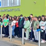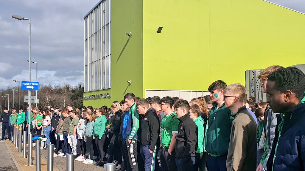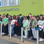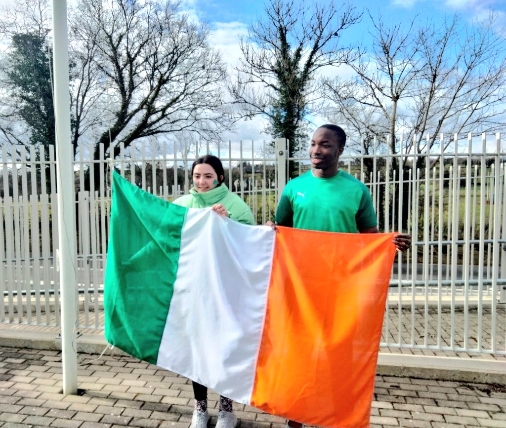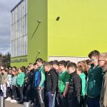 Our National flag was introduced by two representatives of the Student Council, Emmanuel Talabi and Lorna McKiernan. This took place while the National Anthem was played on the PA system, thanks to Mr Duignan. During the course of his address Mr McCaffrey announced that a sizeable sum of money (€603) had been raised for the Red Cross appeal to help Ukranian refugees. This was done through a Lá Glas event where students and staff wore in green, with proceeds going to the Red Cross appeal. Mr McCaffrey thanked all concerned for their efforts and a minutes silence was observed for the war victims of Ukraine.