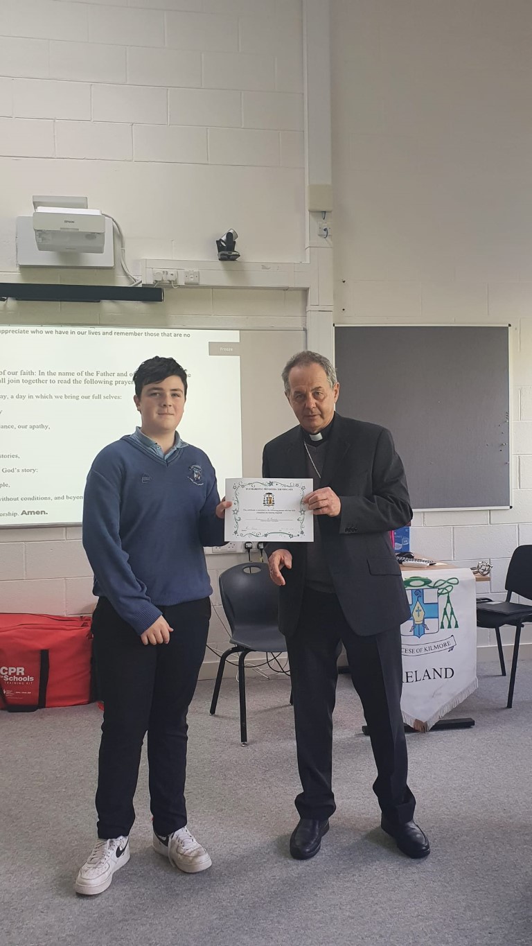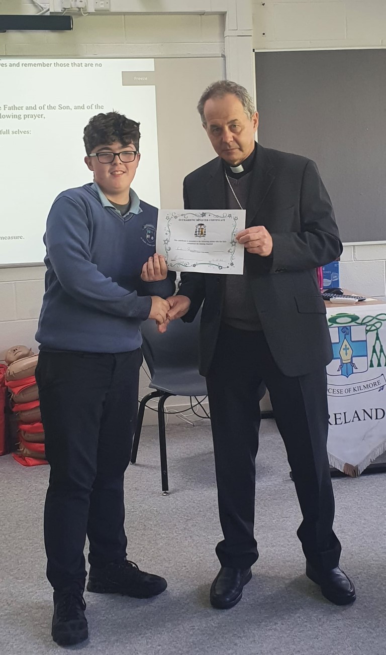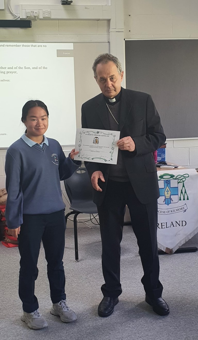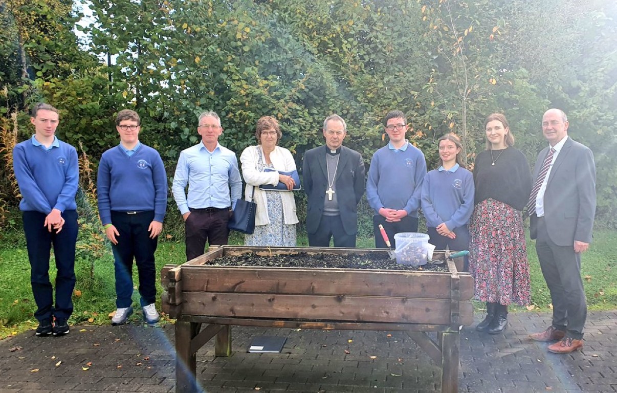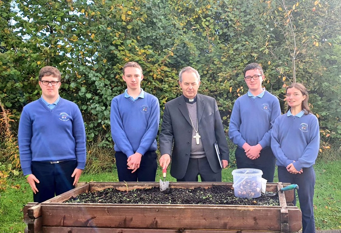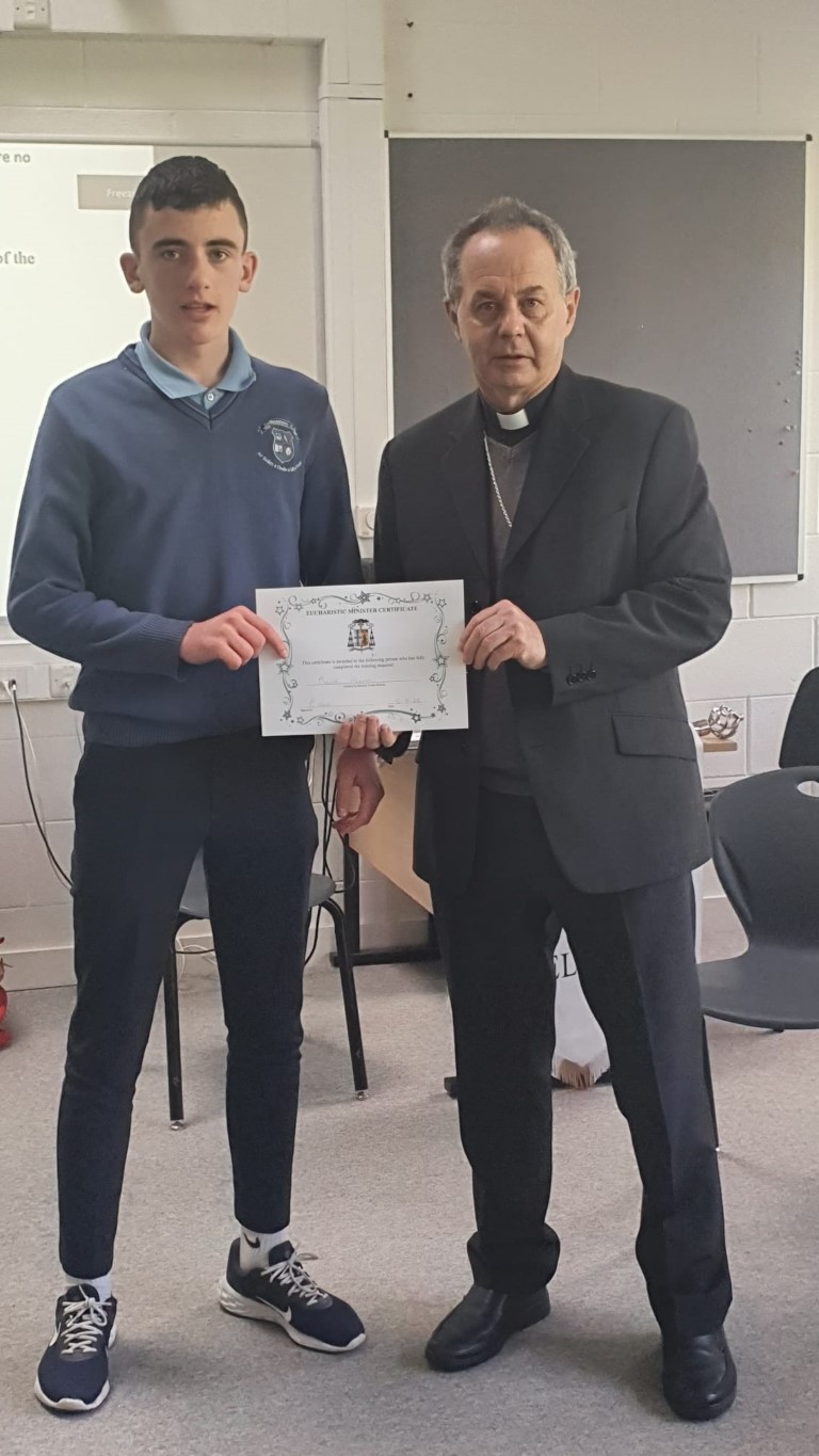 Following a prayer service Bishop Martin Hayes also presented the TY students who had recently completed Eucharistic Minister Training with their Certificates. He also planted some bulbs in our school garden. Thank you to our school Chaplian Mr Kane for organising the visit.
