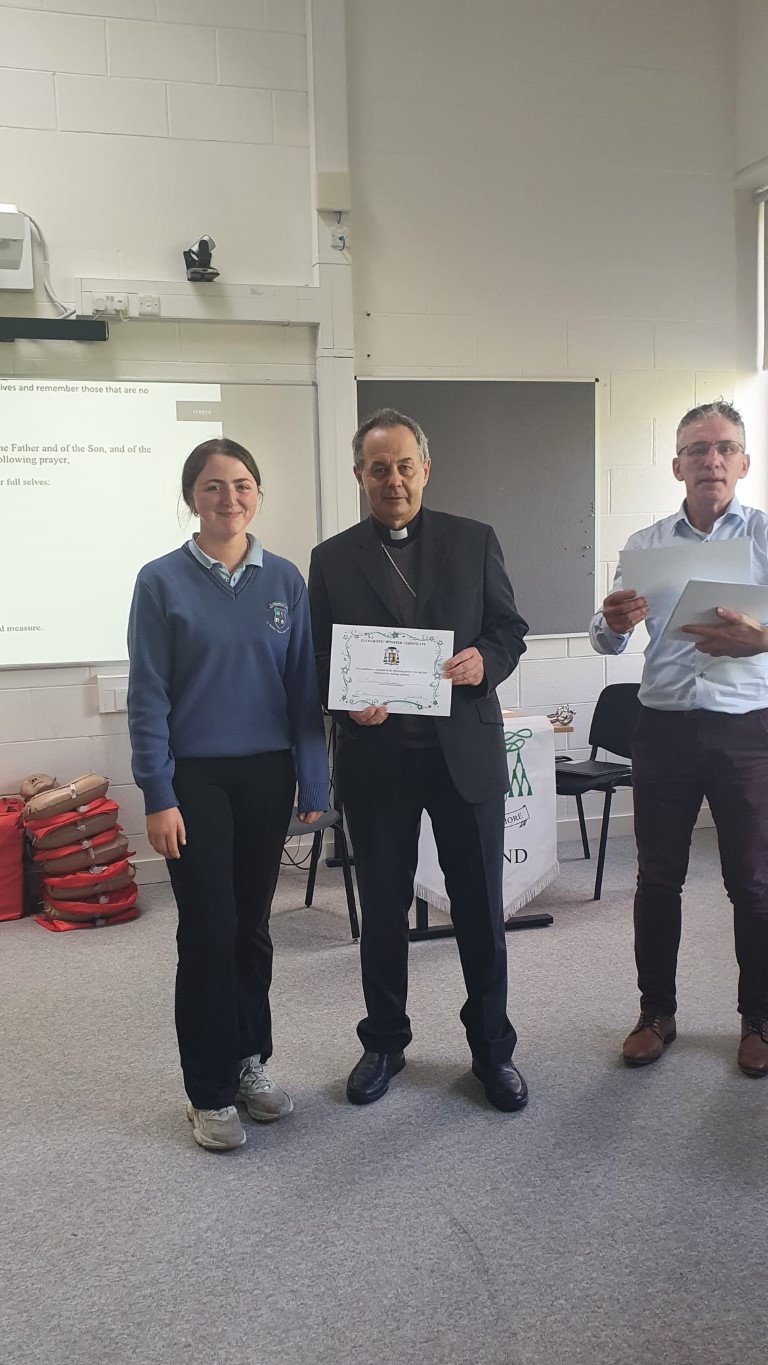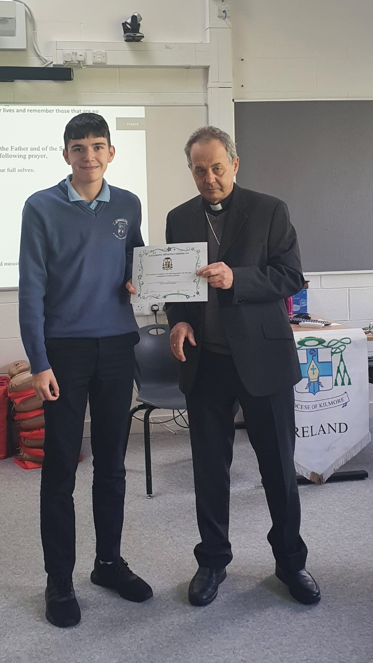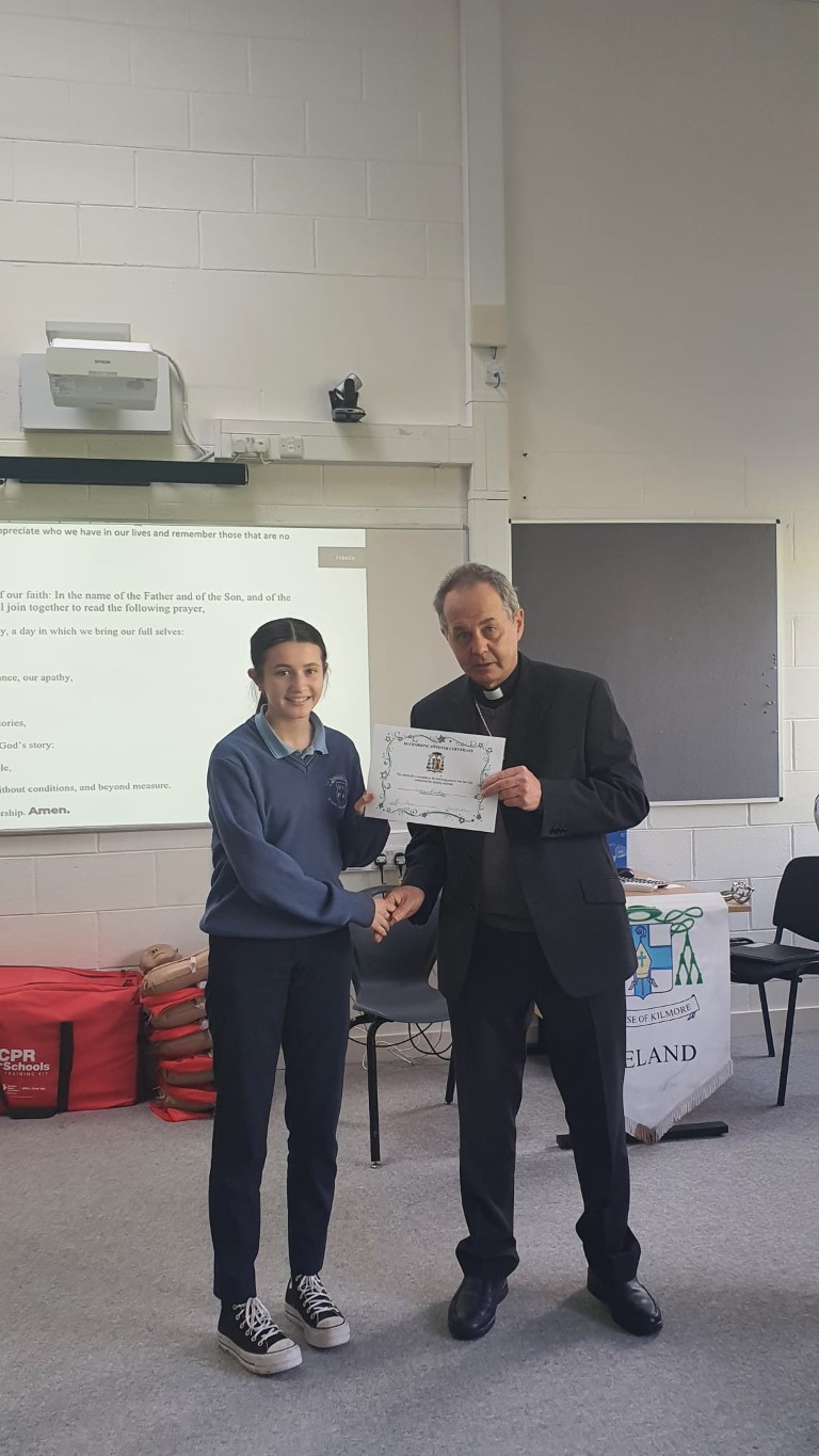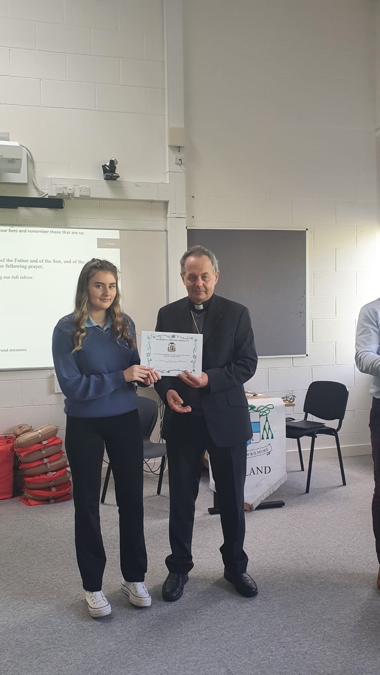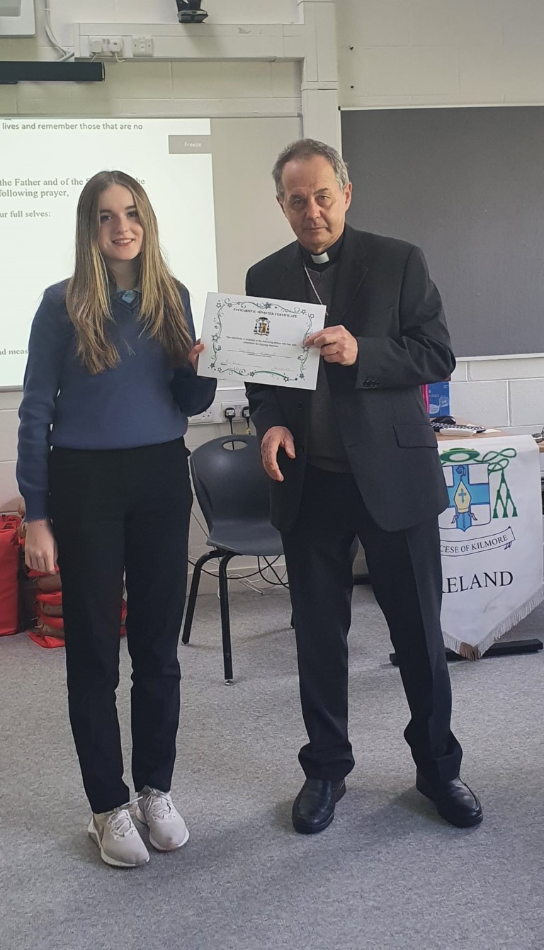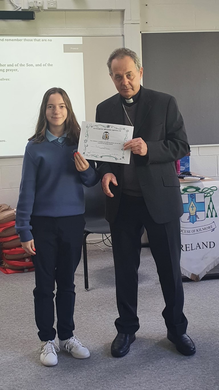 Following a prayer service Bishop Martin Hayes also presented the TY students who had recently completed Eucharistic Minister Training with their Certificates. He also planted some bulbs in our school garden. Thank you to our school Chaplian Mr Kane for organising the visit.