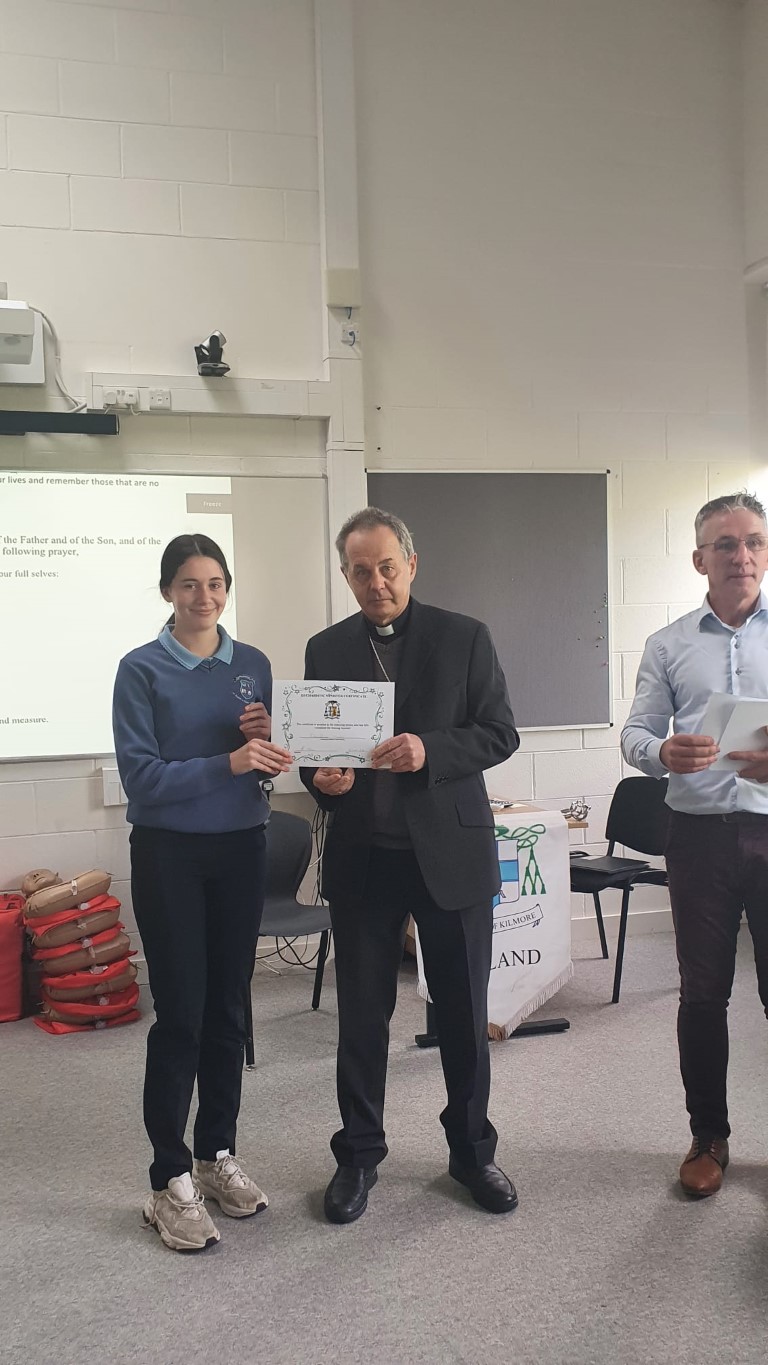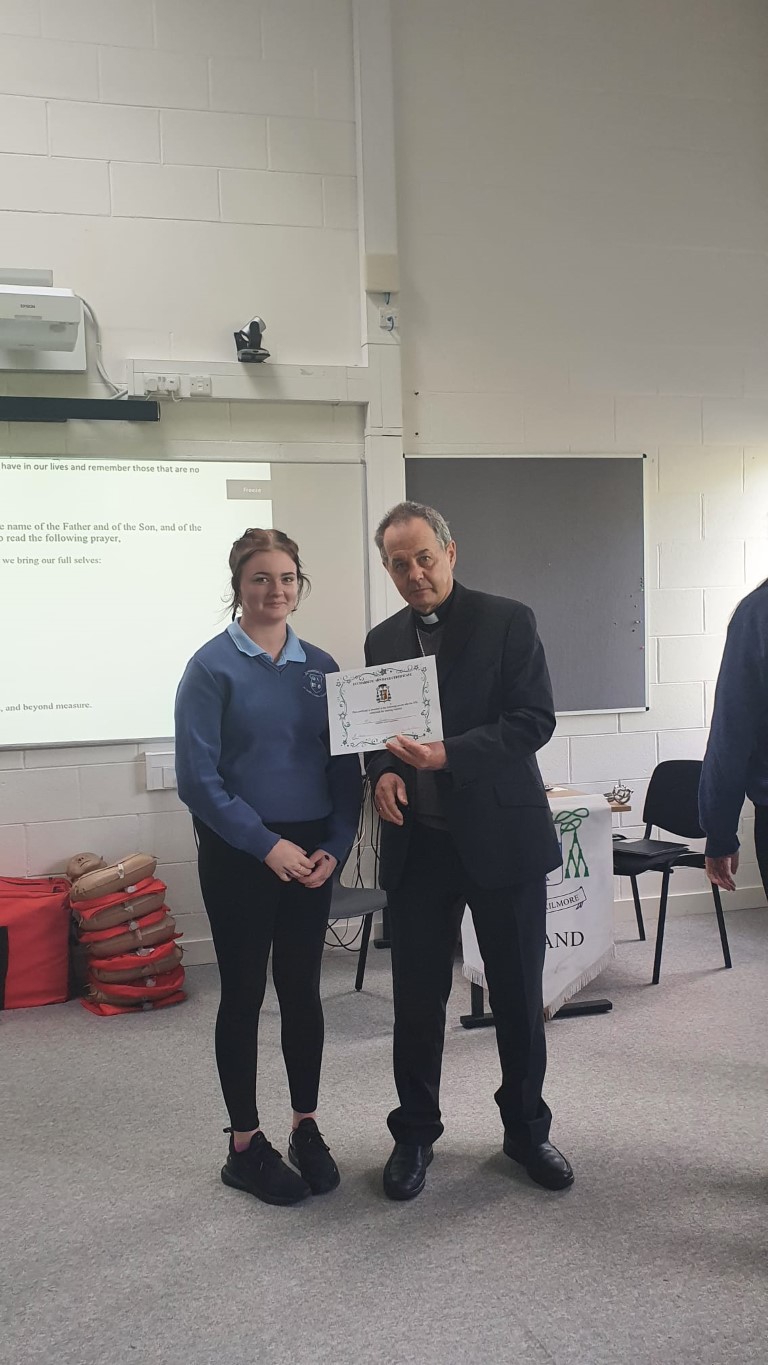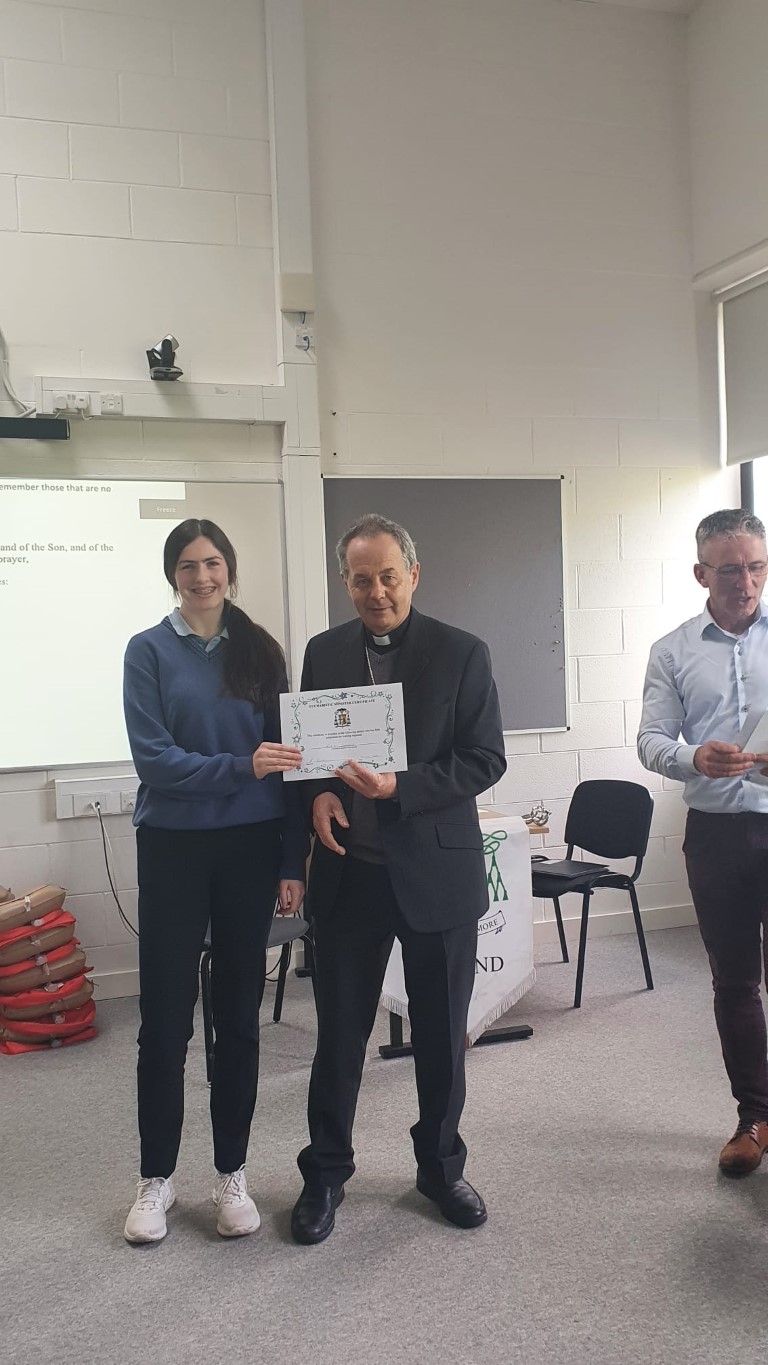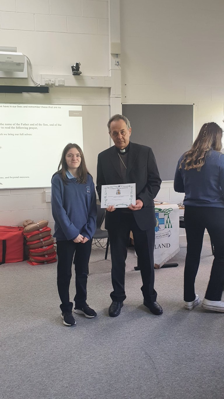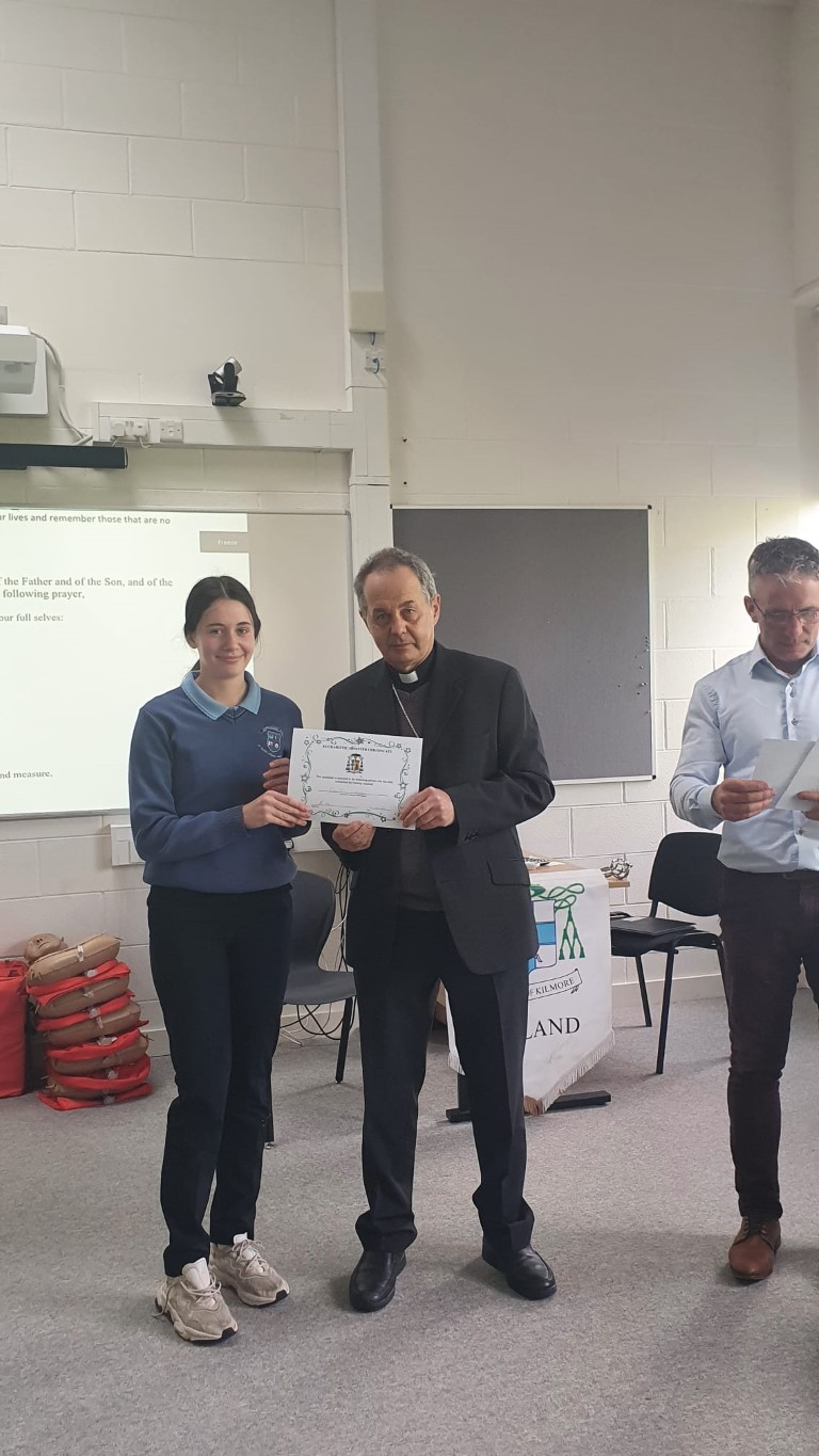 Following a prayer service Bishop Martin Hayes also presented the TY students who had recently completed Eucharistic Minister Training with their Certificates. He also planted some bulbs in our school garden. Thank you to our school Chaplian Mr Kane for organising the visit.