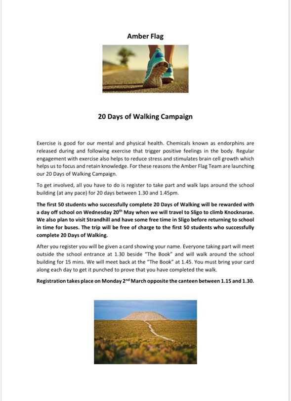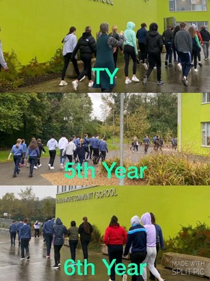 - We will get studnets exercising outisde in the fresh air at lunchtime to improve their metal and physical health. This will also raise awareness among students of our annual hosting of the Darkness into Light walk in aid of Pieta House.