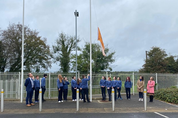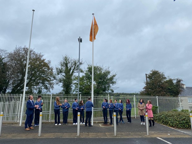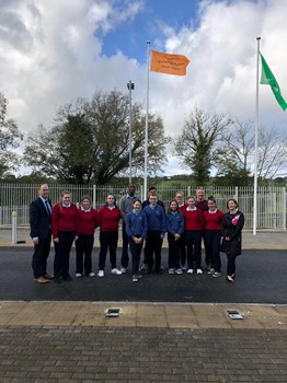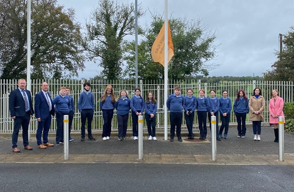 The 2021-2022 Amber Flag Team gathered with Co-ordinators Ms Garvey and Ms McWalter, Principal Mr McCaffrey and Deputy Principal Mr Cunnane to raise our most recently awarded Amber Flag.