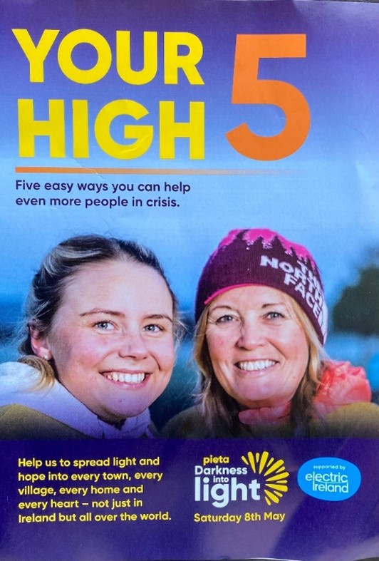 Unfortunately, we cannot gather together this May to show our support for the outstanding work of Pieta House. However, we have all learned how we can stay in touch, work together, support and encourage each other “virtually” over the past year. Throughout the pandemic Pieta House have continued to provide help and support to people in crisis. The lockdowns coupled with the requirement to maintain social distance has made it more difficult for all organisations to raise the funds that they need. However, many organisations, like Pieta House, are experiencing a growing demand for their services and they need donations now more than ever.