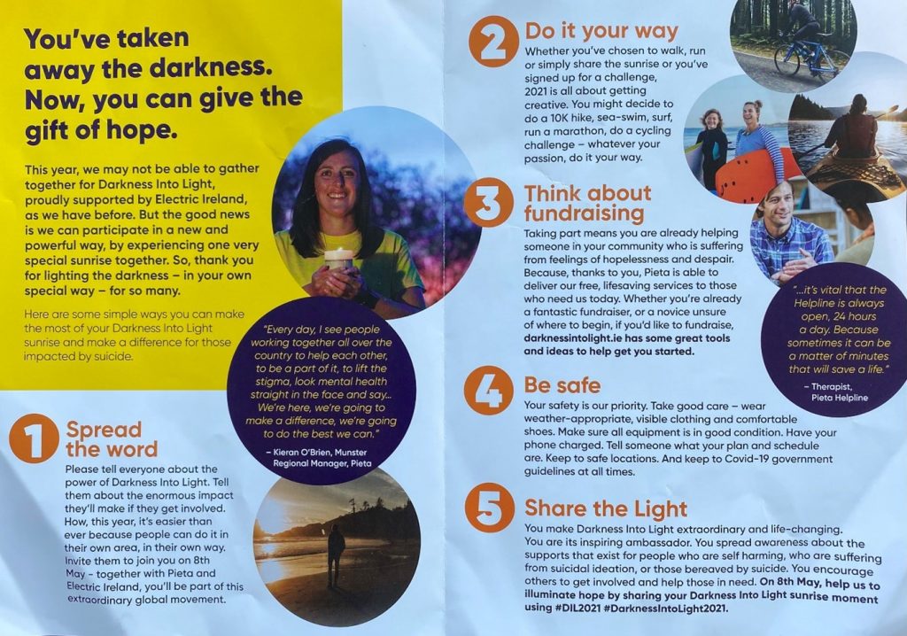 This year the Amber Flag Team are asking everyone to register for DIL 2021 and to spread the inspiring story of Darkness into Light among your friends, colleagues and wider family. Every person that takes part, ensures that another crisis call is answered, another appointment to see a therapist is made – even another life saved.