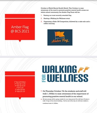 Congratulations to all the students and staff who successfully reached their goal of walking 1,000km in one day. Each year group came out for one class period and walked laps of the school campus. Our combined total exceeded our 1,000km target. While the weather may have been grey, the combination of fresh air, exercise and camaraderie along the way ensured that everyone returned to class with a pep in their step. Walking for Wellness was the first activity organised by the Amber Flag Team for the 2021-2022 school year and marks World Mental Health Day which takes place on Sunday 10th October.